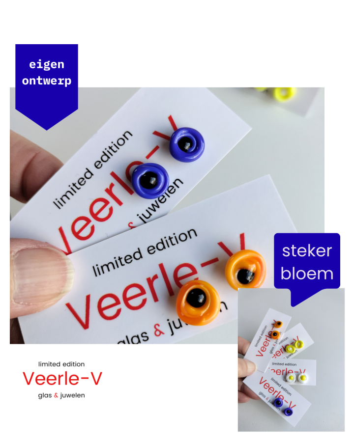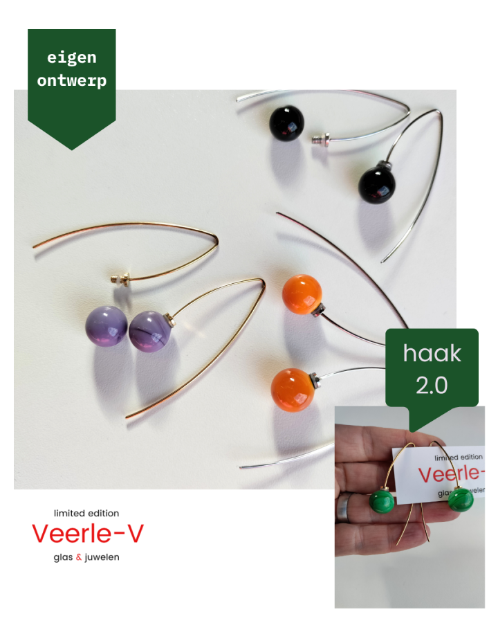 ‘Lucifers’ zijn eigen ontwerp. ze worden voor het atelier met de hand gemaakt. en het nieuwste eigen ontwerp (2026) is de Haak 2.0.: en haakoorbel met langer beentje achter het oor .